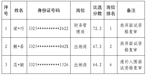 现将2025年丽水市文化旅游投资发展集团有限公司公开招聘工作人员放弃及递补入围面试资格复审人员名单公布如下: