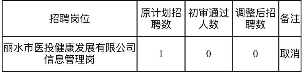 根据《丽水市文化旅游投资发展集团有限公司公开招聘工作人员公告》规定及各岗位报名审核通过情况,部分岗位因不足招聘公告比选比例而取消,现对取消情况进行公布,具体如下: