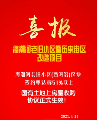 截至4月25日上午,该项目已完成签订收购协议106户,签约率51.9%,根据海潮河老旧小区暨历史街区改造项目(海潮河老旧小区)国有土地上房屋收购公告2020(第二号)的规定,该区块房屋收购补偿协议正式生效!