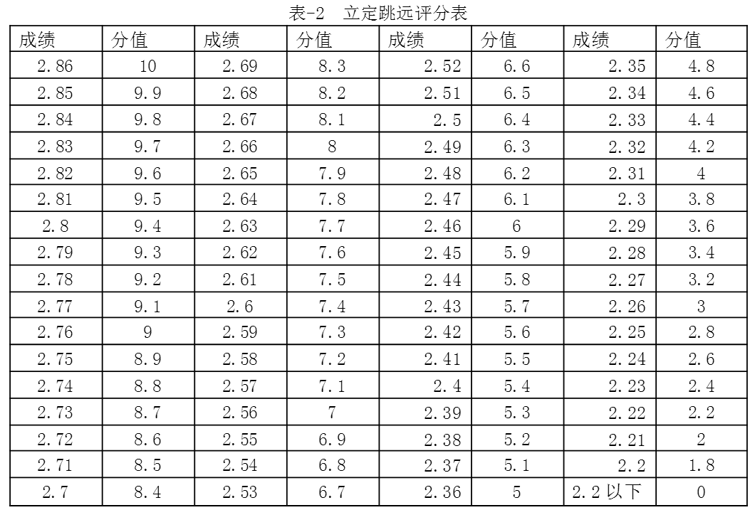 (1)测试方法:助跑起跳摸高,摸最高点计其成绩,每人测两次,计其中一次最佳成绩(精确到厘米)。助跑距离和助跑方法不限。