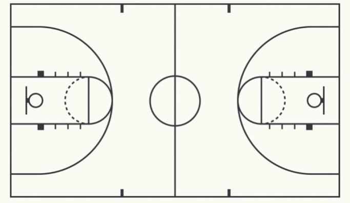 (1)测试方法:如下图所示,以篮圈中心投影点为圆心,5.5米为半径所划的弧线上设置5个投篮点(球场两侧0度角出处,两侧45度处和正面弧顶),每个点放置5个球,共25个球,测试时间为1分钟,要求测试者必须在弧线外投篮,球出手前双脚不得踩线,若踩线投中则计为无效投篮,不得分,每人测2次,取最好成绩。