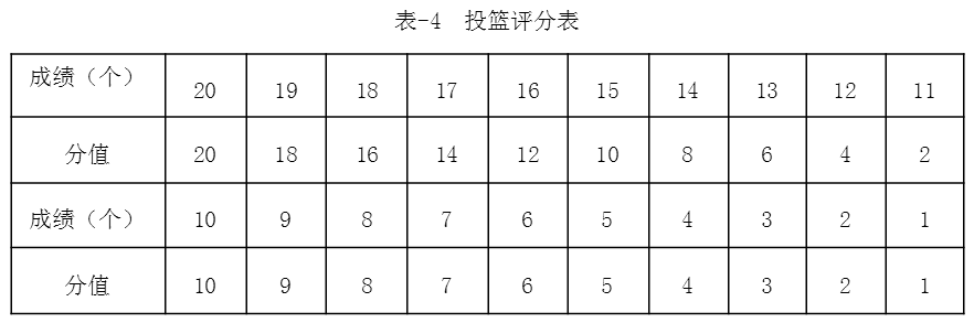 (2)评分标准(见表-4):每投中一球,得1分,投中20球(含)以上为满分20分。