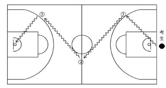 (1)测试方法:测试者在球场端线中点站立,面向前场,用右手运球至①处,,以测试者起动跑开始计时,在①处做背后运球变向,换左手向②处运球,至②处做左手后转身运球变向,换右手运球至③处,右手胯下运球后右手上篮。球中篮后方可用左手运球返回③处,做背后运球,换右手运球至②处做右手后转身运球变向,运球至①处左手胯下运球后左手上篮。球中后做同样动作再重复一次,回到原处停表。(如下图所示)篮球场地上的标志①、②、③为以40厘米为半径的圆圈,①、③到端线的距离为6米、到边线的距离为2米。②在中线上并到中圈中心距离为2.8米。要求测试者在测试时必须任意一脚踩到圆圈线或圆圈内地面,方可变向,否则视为无效,不予计分。每人测试二次,记其中一次最佳成绩。
