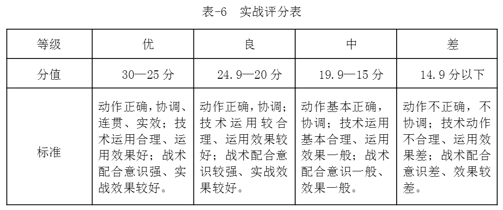 2.评分标准:考评员参照实战评分表(见表-6),从动作的正确、协调、连贯程度,技、战术运用水平以及配合意识等方面,独立对考生进行综合评定。按30分制打分,所打分数至多可到小数点后一位。