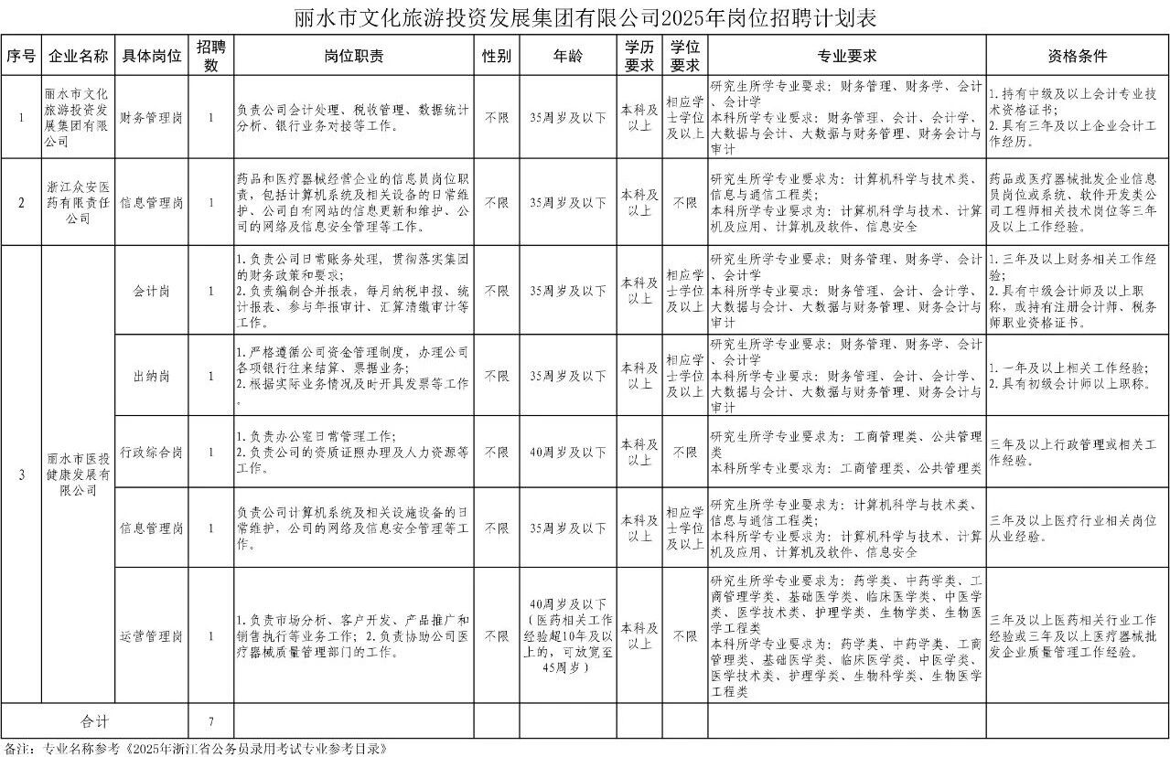 本次共招聘工作人员7名,聘用人员实行劳动合同制管理。具体招聘单位、岗位、人数和报考所需资格条件等详见《丽水市文化旅游投资发展集团有限公司2025年岗位招聘计划表》(附件1)。